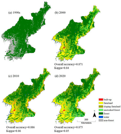 Remote-sensing technology has revolutionized the field of environmental monitoring, particularly in land use and deforestation analysis. However, when it comes to North Korea, remote-sensing-based classification of land use or deforestation encounters specific limitations due to limited ground truth information. Previous studies have explored the use of remote-sensing techniques to map land use in North Korea. This involves analyzing satellite imagery to classify and identify different land cover types [21,22], such as forests, agricultural lands, urban areas, and water bodies [23]. Researchers have utilized time-series remote-sensing data to detect and monitor land use changes in North Korea. By comparing multiple images acquired over different time periods, identify areas where land cover has transformed, providing insights into patterns of urbanization, deforestation [24], and agricultural expansion [25]. However, they only examining forest area dynamics did not account for the different categories of forest cover, low level types.
