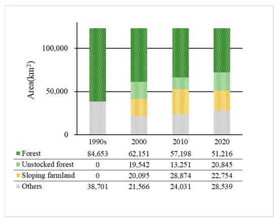 Changes in vegetation cover types in North Korea from the 1990s to 2020. The total area of North Korea is 123,354 km2.