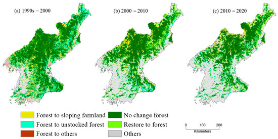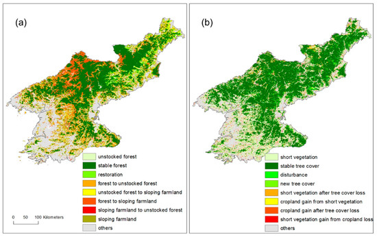 The two deforestation patterns in North Korea, namely, sloping farmland and unstocked forest, reduce the ability to withstand natural disasters. Large-scale forest fires, commercial logging, and expanding farmlands in hilly areas are the main drivers of deforestation and forest degradation in North Korea. Our results provide a comprehensive deforestation map of the two classes of deforested land. Between 1990 and 2020, forestland areas of 14,181 km2 and 17,657 km2 were converted to sloping farmland and unstocked forest, respectively, and these trends are consistent with other research on North Korea [5]. In addition, this study presents a spatiotemporal trajectory analysis for the first time for the detection of two patterns of deforestation in North Korea.