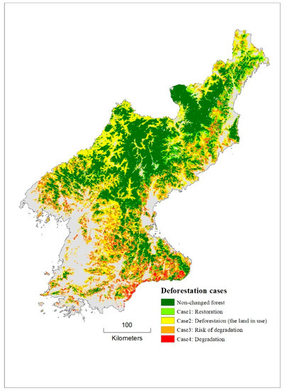 Due to its mountainous terrain, North Korea is already highly vulnerable to natural disasters, and its depleted forests show exacerbated soil erosion and poor water retention. These factors have significantly increased the risk of extreme weather events, such as flash floods and landslides [8,9]. Deforestation has played a major role in the environmental degradation of North Korea. The combination of natural disasters, extreme weather events, and deforestation, and the resulting soil loss have created an unsustainable environment. In addition, North Korea is an important location in the ecological network of Northeast Asia and plays a vital connecting role on the Korean Peninsula. To systematically prioritize restoration and planning efforts, the regional forestland use characteristics and spatial and temporal deforestation changes must be better understood [10].