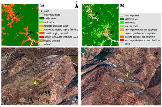 Comparison of our results (a) with the GLAD dataset (b) and a Google Earth Image taken on 2 November 2018 (c,d). The geographical coordinates of the points are P1: 40°57′7.29″ N, 127°8′49.28″ E; P2: 41°10′45.41″ N, 126°57′31.03″ E.