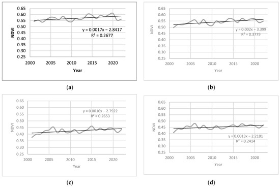- Han, W.; Chen, D.; Li, H.; Chang, Z.; Chen, J.; Ye, L.; Liu, S.; Wang, Z. Spatiotemporal Variation of NDVI in Anhui Province from 2001 to 2019 and Its Response to Climatic Factors. Forests 2022, 13, 1643. [Google Scholar] [CrossRef]