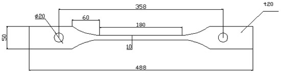 According to ASTMD143-94 (2000) Test Methods for Small Flawless Wood Specimens and GB/T 1927.14-2021(2021) Test Methods for Physical and Mechanical Properties of Small Flawless Specimens of Wood, the tensile creep test specimen is shown in Figure 2. The specimen is dumbbell type; with the standard section size was 20 mm × 10 mm × 180 mm. Here, the dimension of 180 mm was in parallel-to-grain, and its density was 1.1 g/cm3. Its water content (mass fraction) was approximately 9%.
