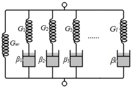 The shear relaxation modulus G(t) in the time domain can be obtained by the inverse Laplace transform of Equation (6). Since the shear relaxation modulus is usually represented by Prony series in commercial finite element software such as Marc, Abaqus, Ansys, Comsol, etc., this paper uses the multi-branch generalized Maxwell model (as shown in Figure 4) to fit the shear relaxation modulus, and obtains it in the form of a Prony series as follows: