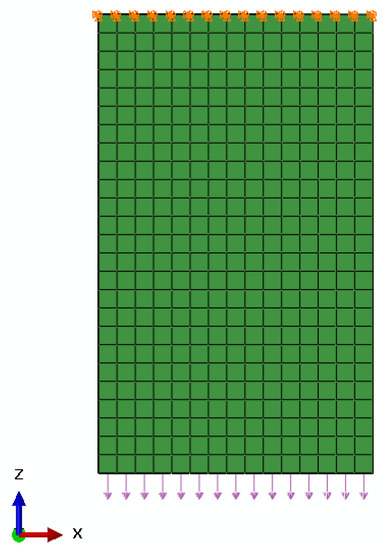 Step 3: Establishing the creep finite element model. Shear relaxation modulus Equation (7) is employed as the creep constitutive model of bamboo scrimber. A creep finite element model of the bamboo scrimber tensile specimen is developed, as shown in Figure 5. By utilizing the creep finite element model, the creep strain of the specimen at any given time can be calculated.