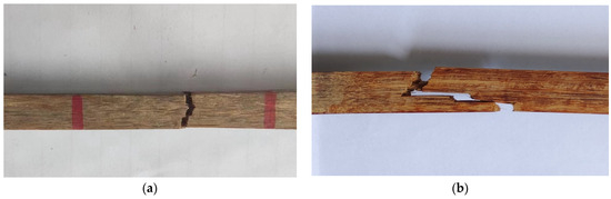 The failure mode of the specimens is illustrated in Figure 6. The fracture positions were uniformly distributed across the standard section of the specimens. The fracture shapes exhibited were either uniform or oblique, which was similar to the static tensile failure mode of bamboo scrimber reported by Wang et al. [24,25]. During the experiment, when the midline of the specimen basically coincided with the tension action line, the force applied to the standard section of the specimen remained relatively consistent. Due to the edge effect, the edges of the specimen were typically the first to break, followed by complete disintegration of the specimen. Consequently, the failure form exhibited a uniform fracture pattern. When the center line of the specimen deviated from the tensile action line, the edge stress near the tensile action line was high, which was likely to be destroyed first. Then, the specimen would undergo eccentric tension and fail in a manner of oblique fracture. Through video monitoring of the creep experiment, it was observed that the deformation of the specimen gradually changed slowly on the day before the fracture, reaching a maximum change of 0.005 mm in the last 10 s. Subsequently, the specimen failed instantaneously in the last second. Prior to the fracture, there were no visible cracks or other signs of damage, indicating that the creep failure mode of the bamboo scrimber under tensile load was an instantaneous failure.
