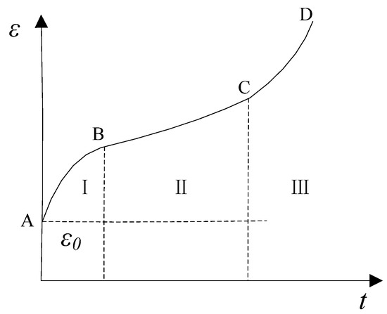 Creep refers to the deformation over time that occurs in an object under constant stress. The typical creep curve, as proposed by the physicist Andrade, is illustrated in Figure 7. The static strain, denoted by ε0, can be divided into three stages: the unstable creep stage (AB stage), the stable creep stage (BC stage), and the accelerated creep stage (CD stage). During the unstable creep stage, the creep primarily arises due to the unstable flow of material with a gradually decreasing creep rate. Consequently, the material hardens. In the stable creep stage, the creep is mainly caused by the viscous flow of the material with a remaining approximately constant creep rate. The creep curve is approximately linear, and the duration of the stable creep time is typically longer, which constitutes the main stage of the creep phenomenon. In the accelerated creep stage, the creep rate increases rapidly until the creep failure.