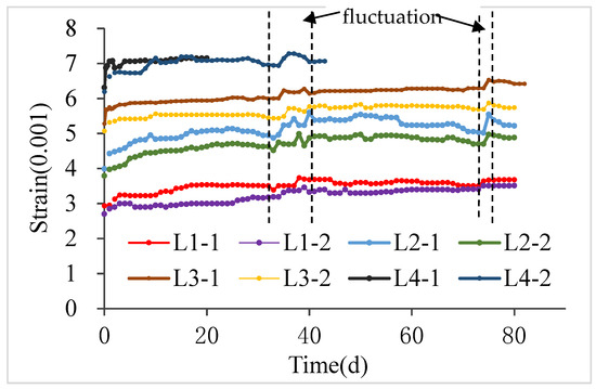 The graph in Figure 8 illustrates the creep strain test results for bamboo scrimber specimens. The test strain is defined as ε = △L/L, where △L is the deformation measured by a dial gauge, and L is the measuring distance of the dial gauge relative to the specimen. It could be observed that: (1) The creep strain trends of specimens with different stress levels were similar, and the total creep strain increased with the increase in stress level. However, the creep strain curves of specimens with the same stress level were not exactly the same. This may be attributed to the differences in raw material properties, bamboo bundle paving, and carbonization process among other factors. (2) All specimens exhibited an unstable creep stage followed by a stable creep stage, with no accelerated creep stage. This aligned with the creep phenomenon observed through video monitoring. The primary reason for this behavior is that bamboo scrimber does not experience significant cross-sectional area reduction or micro-cracks when subjected to long-term tensile loads. As a result, there is no acceleration in the creep deformation stage, which is related to its static tension in parallel-to-grain with linear elastic deformation and no plastic deformation. The unstable creep stage occurred from day 0 to day 5 when the creep strain changed greatly and the strain rate decreased continuously. The stable creep stage spanned from day 5 to day 80 when the creep strain changed slowly and experienced certain fluctuations. The main fluctuation periods were identified as days 34–41 and 74–76, and the causes of these fluctuations would be discussed in detail later. (3) Two specimens, L4-1 and L4-2, were damaged after 20 days and 43 days, respectively. The strain at the time of failure was 7.148 × 10−3 and 7.065 × 10−3, respectively. The other specimens remained intact.
