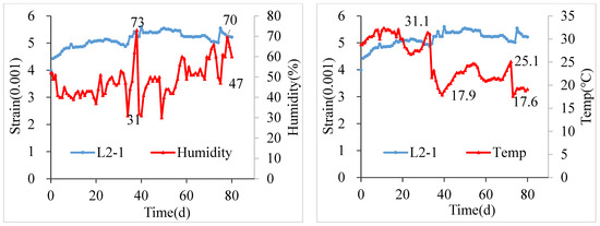 Figure 9 presents a comparison between the creep strain of specimen L2-1 and the ambient temperature and humidity. During the two main fluctuation periods of creep strain, the creep strain of specimen L2-1 increased by 0.727 and 0.364, respectively. Simultaneously, the ambient temperature decreased by 13.2 °C and 7.5 °C respectively, and the ambient humidity increased by 42% and 23%, respectively. This observation was consistent with the findings of Xu et al. who reported that the creep strain of bamboo increased with the increase in temperature and humidity, and decreased with the decrease in temperature and humidity [26,27]. In these two main fluctuation periods, the decrease in ambient temperature reduced the creep strain of the specimen, and the increase in ambient humidity increased the creep strain of the specimen. The combined effect of ambient temperature and humidity increased the creep strain of the specimen. Therefore, it can be concluded that ambient humidity is the main factor affecting the fluctuation in creep strain in this case.