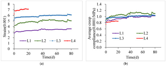 Average creep compliance and average creep strain curve: (a) average creep strain, (b)average creep compliance.