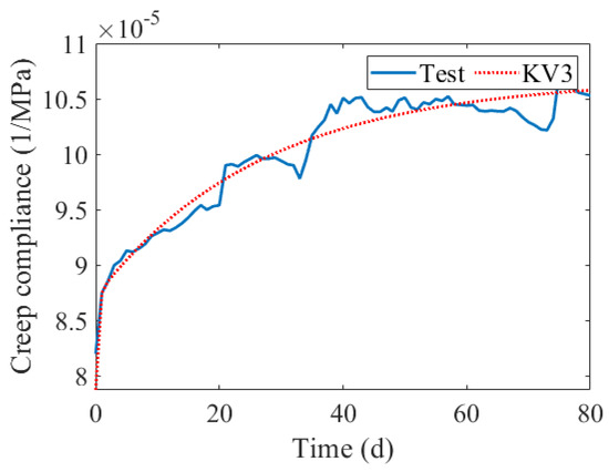 The fitting curve of the KV−3 model and the test average creep compliance of bamboo scrimber are presented in Figure 11. The fitting curve of the KV−3 model exhibited a good agreement with the test curve, as evidenced by the fitting coefficient R−square of 0.92. The test curve is significantly affected by environmental fluctuations, whereas the fitting curve remains relatively smooth. It can be observed from the fitting curve that the creep compliance increase rate of bamboo scrimber exhibited a relatively large fluctuation during the unstable creep stage. However, it tended to stabilize in the stable creep stage.