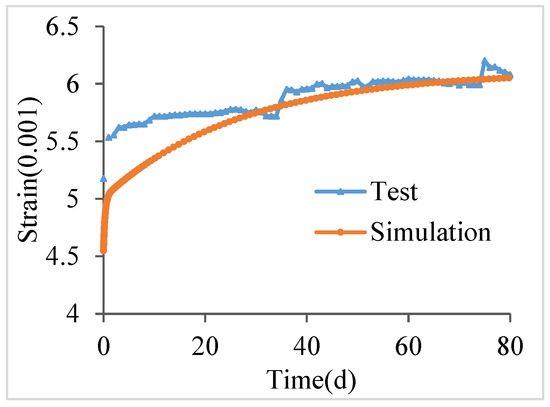 Secondly, in accordance with Criterion 2 and Figure 14, the ratio of creep strain in the 50-year period to initial strain was less than 1, which meets the requirement of Criterion 2. Therefore, the creep failure strain of bamboo scrimber was determined to be 7.065 × 10−3.