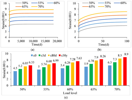 Based on GB 50068-2001 Unified Standard for Reliability Design of Building Structures, the design reference period is set at 50 years (18,263 days) [29]. The creep deformation of a bamboo scrimber tensile specimen was calculated using a finite element model as shown in Figure 14. The creep strain curves at all load levels exhibited similar characteristics. The creep strain growth rate was fast in the early stage but slowed down in the later stage. With an increase in load level, the creep strain also increased. In Figure 14c, ε0 represents the static strain, ε5d indicates the total creep strain at 5 days, ε80d signifies the total creep strain at 80 days, and ε50y depicts the total creep strain at 50 years. The creep strain histogram at all load levels was consistent. The ratio of creep strain at 80 days to static strain at all load levels was 34.4%, 33.6%, 34.8%, 33.8%, and 34.9%, respectively, which were similar. The ratio of creep strain in the first 5 days to 80 days to a 50-year design reference period was 37.9% and 84.5%, respectively, indicating that the creep strain during the early period accounts for the majority of the total design reference period.