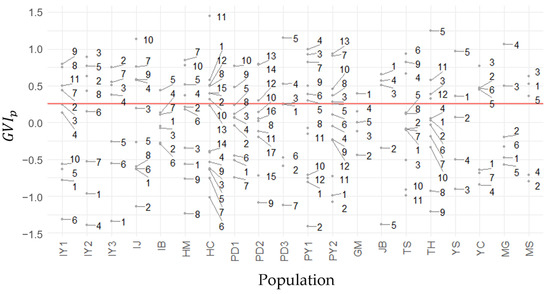 Evaluation of candidate trees within base populations using , and . The numbers within each population represent the IDs of candidate trees. The red line indicates the baseline for 35% selection intensity in each index.