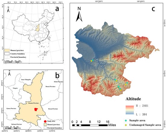 Research scope map. (a) The location of Shaanxi Province in China. (b) Lantian County’s location in Shaanxi Province. (c) The study area and undamaged study area’s location in Lantian County.
