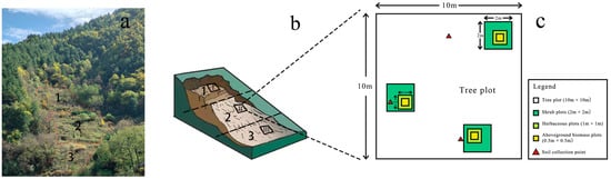 Within each plot, vegetation data were measured and sampled using plots of various sizes: 10 m × 10 m for trees, 2 m × 2 m for shrubs, and 1 m × 1 m for herbaceous plants. For each plot, 3 tree plots (1 on the upper slope, 1 on the middle slope, and 1 on the lower slope), 9 shrub plots (3 on each slope), and 9 herbaceous plots (3 on each slope) were randomly established (Figure 2). The plots were spaced at least 10 m apart to mitigate mutual interference. All plant species within the plots were documented, including functional traits such as tree height (H) in meters, diameter at breast height (DBH) in centimeters, and canopy density (%) (CD) for trees; shrub height (H) in centimeters, diameter at breast height (DBH) in millimeters, and canopy coverage (%) (COV) for shrubs; and plant height (H) and quantity (NO.) for herbaceous species. For H measurement, a measuring tape and laser rangefinder were used; DBH was measured using a caliper; and CD and COV were determined based on the Braun–Blanquet scale. Leaf sampling involved collecting 3–5 leaves per plant species. On-site measurements of wet weight (WW) were conducted, followed by laboratory measurements of dry weight (DW), leaf area (LA), and leaf thickness (LT). Furthermore, all aboveground plants within the herbaceous plots were harvested to determine the aboveground biomass (W) of the herbaceous layer.