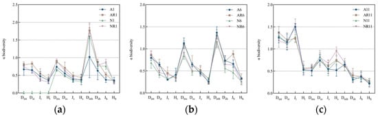 α diversity in the vertical strata of each sample area. Groups: (a) one-year restoration sample area, (b) six-year restoration sample area, (c) eleven-year restoration sample area.-Margalef richness index for the tree; -Simpson’s index of dominance for the tree; -Pielou’s uniformity index for the tree; -Shannon–Wiener diversity index for tree; -Margalef richness index for the shrub; -Simpson’s index of dominance for the shrub; -Pielou’s uniformity index for the shrub; -Shannon–Wiener diversity index for shrub; -Margalef richness index for the herb; -Simpson’s index of dominance for the herb; -Pielou’s uniformity index for the herb; -Shannon–Wiener diversity index for herb.