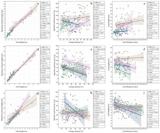 Vegetation pattern of the tree layer. In the one-year sample area: (a) distribution of tree height and diameter at breast height; (b) distribution of canopy density and specific leaf area; (c) distribution of leaf thickness and leaf length. In the six-year sample area: (d) distribution of tree height and diameter at breast height; (e) distribution of canopy density and specific leaf area; and (f) distribution of leaf thickness and leaf length. In the eleven-year sample area: (g) distribution of tree height and diameter at breast height; (h) distribution of canopy density and specific leaf area; (i) distribution of leaf thickness and leaf length.