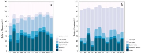 The analysis of various vegetation features in the shrub and herbaceous layers is presented in Figure 5. In the shrub layer, the vegetation height at the reference sites consistently exceeded that at the restoration sites following the landslide. With increasing time since restoration, the frequency distribution of vegetation height in the artificially restored sites tended to approach that of the reference sites, while the frequency in the naturally recovering sites gradually surpassed that of the reference sites. The basal stem diameter of vegetation exhibited certain dominance in sites A1, AR1, and N1, with the lowest dominance observed in site A11. Canopy coverage was relatively higher at sites AR1 and N1. The specific leaf area (SLA) of vegetation was lowest at site N11 and highest at site N6. Leaf water content was relatively consistent across all sites except for site A1, where it shows a distinct pattern. In the herbaceous layer, vegetation height dominance was prominent at site N1. Over time, the vegetation height at the post-landslide restoration sites exhibited an initial increase followed by a decrease. Herbaceous plant density was most pronounced in sites A6 and AR6, while it shows no significant dominance in the one-year restoration sites. Canopy coverage in the herbaceous layer gradually increased with restoration time, performing well in the six-year and eleven-year periods. Vegetation wet weight exhibited the highest frequency in site NR1, the lowest in site N1, and the difference between vegetation wet weight in the artificially restored sites and references was consistently smaller than that in the naturally recovering sites. Vegetation dry weight frequency was higher in site A1, lower in site AR6, and exhibited relatively similar fluctuations in other sites.
