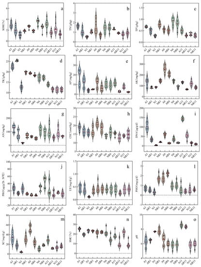 Various physical and chemical properties in the sample plots. Groups: (a) total organic matter content of the soil; (b) total nitrogen content of the soil; (c) total phosphorus content of the soil; (d) total potassium content of the soil; (e) effective phosphorus content of the soil; (f) effective potassium content of the soil; (g) alkaline nitrogen content of the soil; (h) cation exchange capacity content of the soil; (i) dehydrogenase content of the soil; (j) protease content of the soil; (k) urease content of the soil; (l) phosphatase content of the soil; (m) sucrase content of the soil; (n) moisture content of the soil; (o) pH content of the soil.