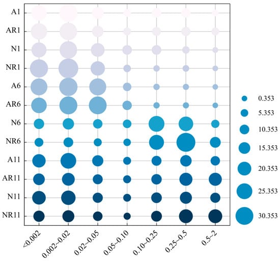 The analysis of differences in soil mineral particle size, mineralogical composition, and properties is presented in Figure 7. It is evident that with increasing time since the landslide, soil particles tend to become more sandy (0.100~2.000 mm). At the one-year restoration sites, the distribution of soil particles was generally similar. Among these, site N1 exhibits a trend of decreasing soil particle size, with the range of 0.500~2.000 mm representing the smallest value in this category, while the range of 0.002~0.020 mm had the highest soil particle content. In the six-year restoration sites, the changes in sites A6 and AR6, as well as N6 and NR6, were quite similar. In A6 and R6, which are the artificially restored sites, the distribution of smaller-diameter soil particles (<0.050 mm) was more widespread. Conversely, in N6 and NR6, which are the naturally recovering sites, the distribution of larger-diameter soil particles (>0.100 mm) was more pronounced. In the eleven-year restoration sites, it is apparent that the content of soil particles across different size fractions did not exhibit significant differences. However, the smaller soil particles (<0.020 mm) in both the artificially and naturally restored sites were greater than in the reference sites, while the larger soil particles (>0.250 mm) were slightly lower than in the reference sites.