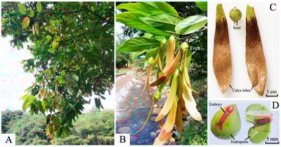 The fruit of H. chinensis is a nut, connected to 1- or 2-year-old branches via a slender carpopodium at the base (Figure 1A,B). The fruit is ovoid and approximately 1.4 cm long and 1.0 cm wide, with a pointed tip. It is covered by five elongated calyx lobes, of which two lobes enlarge into lanceolate or elliptic wings approximately 8.0 cm long and 2.0 cm wide, with 11–12 longitudinal veins. The remaining three lobes do not expand and are approximately 0.5–1.0 cm long (Figure 1C). The fruits of H. chinensis ripen from December to January, turning from green to yellowish-green when ripe. The calyx lobes change from green to brown (Figure 1C). Each fruit contains one seed enclosed by a seed coat. The seed coat can be easily separated from the seed, which consists of a cylindrical red embryo, with a green endosperm. The endosperm splits into four petals, and the bottom of the endosperm is connected to the embryo (Figure 1D).