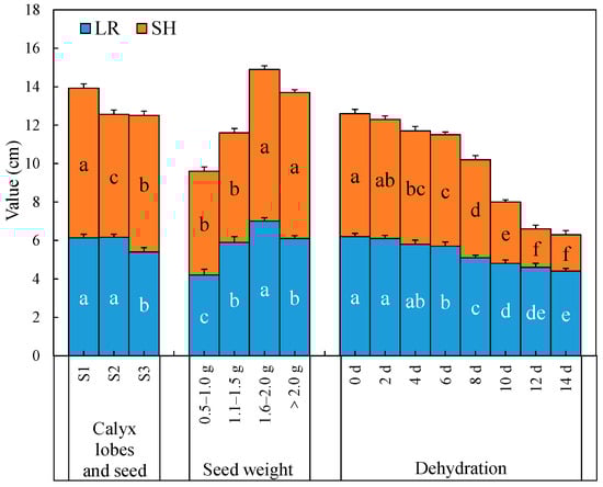 Effects of biological traits on root length and seedling height of H. chinensis seedlings. LR: length of root; SH: seedling height; S1: seeds with calyx lobes and seed coat intact; S2: seeds without calyx lobes but with the seed coat; S3: seeds with both calyx lobes and seed coat removed. Significant differences within the same trait (p < 0.05, using Duncan’s new multiple range test) are indicated by different lowercase letters. The error bars represent SD.