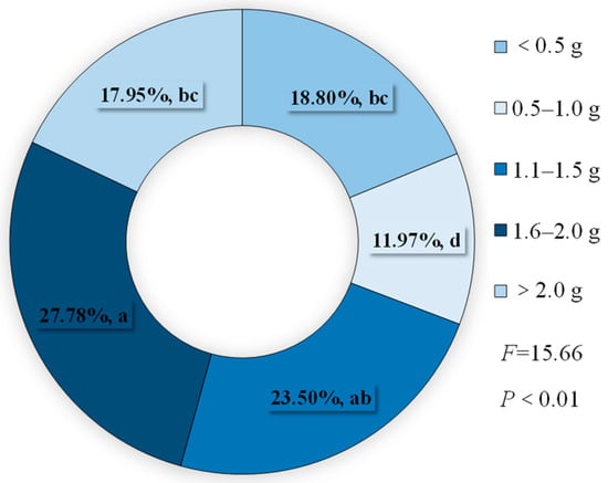 The distribution of seeds among the five weight grades showed significant differences (p < 0.05). Among them, seeds weighing between 1.6 and 2.0 g and between 1.1 and 1.5 g made up a high proportion of all the seeds, accounting for 27.78% and 23.50%, respectively, whereas seeds weighing between 0.6 and 1.0 g had the lowest proportion at 11.97%. Seeds weighing more than 1.0 g accounted for 69.23% of all seeds (Figure 3).