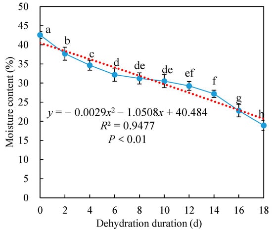 Moisture content of H. chinensis seeds in response to the duration of the dehydration period. Significant differences (p < 0.05, using Duncan’s new multiple range test) are indicated by different lowercase letters. The error bars represent SD.