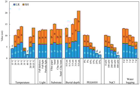 Effects of environmental factors on mean ± SD root length and seedling height of H. chinensis seedlings. LR: root length; SH: seedling height. Significant differences (p < 0.05 using Duncan’s new multiple range test) are indicated by different lowercase letters. The error bars represent SD.