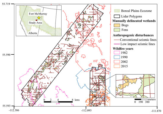 - Chasmer, L.; Lima, E.M.; Mahoney, C.; Hopkinson, C.; Montgomery, J.; Cobbaert, D. Shrub changes with proximity to anthropogenic disturbance in boreal wetlands determined using bi-temporal airborne lidar in the Oil Sands Region, Alberta Canada. Sci. Total Environ. 2021, 780, 146638. [Google Scholar] [CrossRef]
