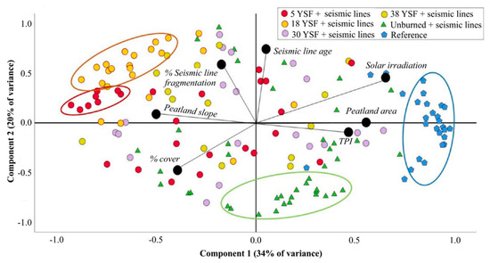 - Dabros, A.; Higgins, K.L.; Pinzon, J. Seismic line edge effects on plants, lichens and their environmental conditions in boreal peatlands of Northwest Alberta (Canada). Restor. Ecol. 2021, 30, e13468. [Google Scholar] [CrossRef]