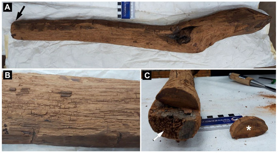 Studied waterlogged archaeological rosewood. (A) Black arrow indicates the sampling site. (B) Surface of waterlogged archaeological rosewood showing brownish coloration with brash fractures. (C) Transverse plane of waterlogged archaeological rosewood showing the formation of cracks along with growth rings (white arrow). Note the semicircular disk cut from the top end of waterlogged archaeological rosewood for the experiment (asterisk).