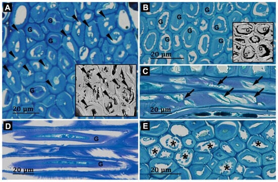 Degradation of fibers at a depth of 4 and 25 mm in waterlogged archaeological rosewood stained with toluidine blue. (A) Fibers without gelatinous (G) layers showing the formation of soft rot cavities in secondary cell walls (arrowheads). Inset indicates the SEM micrograph of corresponding fibers. (B) Fibers with G-layers showing degradation at the boundary of the S2 and G-layers. The inset reveals the SEM micrograph of corresponding G-fibers. (C,D) Longitudinal sections showing the formation of cavities aligned along cellulose microfibrils in fibers without G-layers (arrows in (C)). Note the absence of cavity formation in G-layers (D). (E) Fibers with a relatively wide lumen showing the erosion type of decay (asterisks).