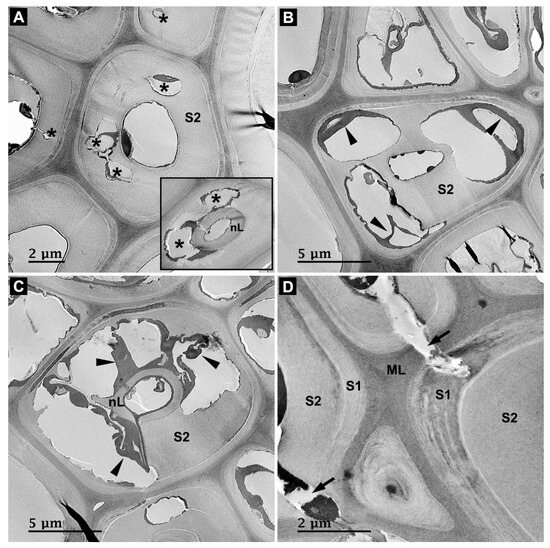 Assessments using TEM revealed details regarding the decay. In Type-I soft rot decay, cavities in fibers without G-layers were detected in the S2 layer but not in the S1 and nL-layers at the early stages of decay (asterisks in Figure 4A and inset). As the decay progressed, cavities coalesced to form large voids in the secondary cell walls of fibers (Figure 4B,C) with remnants of the innermost cell wall layers, including the S3 and/or nL-layers (Figure 4B,C). Electron-dense materials were frequently detected around decayed cell wall regions in the cavities (arrowheads in Figure 4B,C). Cell wall penetration by fungal hyphae across the middle lamella (ML) was occasionally observed (arrows in Figure 4D). By contrast, G-fibers showed initial decay at the boundary of the S2 and G-layers with soft rot cavities (asterisks in Figure 5A and inset). Movement of fungal hyphae across G-layers was occasionally observed (white arrowhead in Figure 5A). As the decay progressed, degradation proceeded toward the outer S2 and inner G-layers (Figure 5B,C), with the accumulation of electron-dense materials noted around decayed cell wall regions in the cavities (arrowheads in Figure 5B,C). The formation of soft rot cavities was not detected in the middle of the G-layers (Figure 5B,C) and L-layers (Figure 5D) during decay. The L-layer was gradually degraded by erosion after the degradation of the G-layer (black arrows in Figure 5D). Cell wall penetration by fungal hyphae across the ML region of G-fibers was occasionally observed (white arrows in the inset of Figure 5D). In the erosion type of decay, at the early stages of decay, erosion trough-like localized depressions in the G-layers were detected in fiber cell walls (arrowheads in Figure 6A) across the extractive layer of the lumen wall (arrows in Figure 6A). As the decay progressed, the cell wall erosion processed toward the S2 layer (Figure 6B,C). The erosion type of decay was occasionally detected together with decay at the boundary of S2 and G-layers (i.e., the second type of decay; inset in Figure 6C). At the advanced stages of decay, fragmented S2 and/or G-layers were frequently detected in the decayed cell walls (Figure 6D).