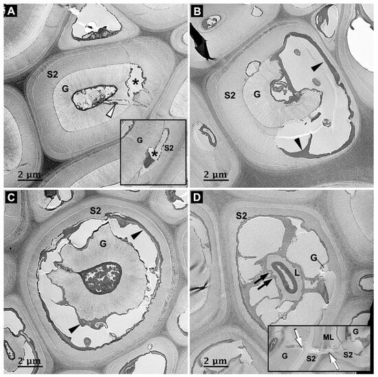Degradation of gelatinous (G) fibers at a depth of 4 and 25 mm in waterlogged archaeological rosewood stained with KMnO4. (A) Formation of soft rot cavities at the boundary of S2 and G-layers at the early stages of decay (asterisks). The cavity was more biased toward the S2 layers than the G-layers (inset). Note cell wall penetration across the G-layer (white arrowhead). (B,C) Degradation of S2 and G-layers with the progression of decay. Note the presence of electron-dense materials around decayed cell wall regions in cavities (black arrowheads). (D) Advanced stages of decay showing an almost completely decayed G-layer, with a remaining highly lignified (L) layer. Note the absence of cavity formation and decay (black arrows) in the lignified (L) layer. The inset indicates cell wall penetration by fungal hyphae across the G-layer, normal secondary wall, and middle lamella (white arrows in the inset).