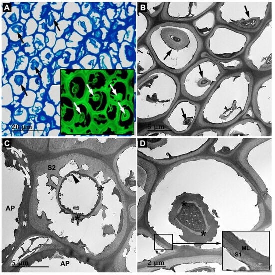 Degradation of fibers on the surface of waterlogged archaeological rosewood stained with toluidine blue (A) and KMnO4 (B–D). (A,B) Fibers showing heavy decay with and without cell wall residues (black arrows in A,B). Cell wall residues showed fluorescence (assessed using CLSM; white arrows in inset) and KMnO4 staining intensity similar to those noted in normal S2 layers. (C) Fibers without a G-layer showing heavy degradation of the secondary cell wall, with the innermost layer remaining (asterisks). Note the un-decayed extractive layer even after complete degradation of the secondary cell wall (arrowhead) and more advanced stages of decay in axial parenchyma cells (AP) than in fibers. (D) Fiber showing degradation of the S1 layer (inset), with the innermost layer (asterisks) and extractives in the lumen remaining. ML, middle lamella.
