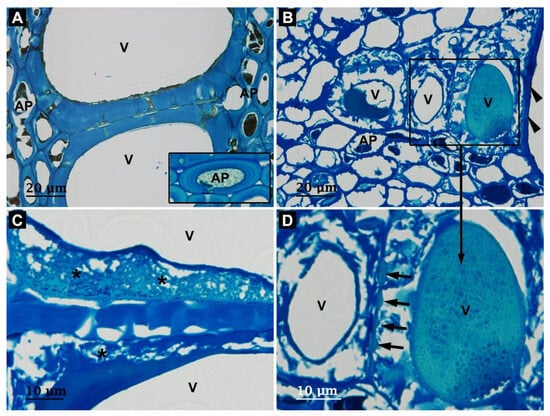 Degradation of vessels and axial parenchyma cells in waterlogged archaeological rosewood stained with toluidine blue. (A) A sample with 25 mm axial depth showing vessels (V) in 2 multiples and axial parenchyma cells (AP) with phenolic extractives in the lumen. Note the multilayered axial parenchyma cell wall with deposits in the lumen (inset). (B–D) A surface sample showing severe degradation of vessel and parenchyma cell walls. Many irregular forms of cavities were observed in vessel cell walls (asterisks in (C)). Note the accumulation of materials attached to the vessel lumen (arrowheads in (B)). Intervessel pit membranes remained even though adjacent vessel cell walls were heavily degraded (arrows in (D)).