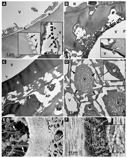 Degradation of vessels (V) in waterlogged archaeological rosewood stained with KMnO4 (A–D). (A,B) Vessels at the early stages of decay showing the degradation of certain deposits coating the innermost cell wall layer (black asterisks in (A) and right inset of (A)), cell wall degradation through pit chambers (B), and invasion of fungal hyphae into the cell wall across the extractive layer of the lumen (white arrow in the inset of (B)). Note the presence of vestures in the vessel cell wall (black arrows in the left inset of (A)) and vessel-ray pit (black arrows in the right inset of (A)) with a difference in KMnO4 staining intensity. (C) A surface sample showing severe degradation of vessel cell walls with many irregular forms of cavities. Note un-decayed layered materials in the lumen (white asterisks) and degradation of the middle lamella between vessel and axial parenchyma cells (AP) (white arrowheads). (D) Vestured intervessel pit membranes (M) at the advanced stages of decay showing an almost intact structure (black arrowheads) even though the adjacent vessel cell walls were extensively degraded. (E) A sample with 1–2 mm axial depth showing fungal hyphae in the vessel lumen (white arrows) together with the formation of many small cavities in the cell wall. (F) Fungal conidia in the lumen showing rough surface ornamentation and an overall globose shape (inset). R, ray cell.