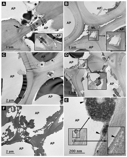 Degradation of axial parenchyma cells (AP) in waterlogged archaeological rosewood stained with KMnO4. (A,B) Axial parenchyma cells at the early stages of decay showing cell wall degradation through simple pit chambers (black arrow in (A)) and across the extractive layer of the lumen (white arrow in the inset of (A)), in addition to the degradation of middle lamella (ML) regions ((B) and inset). Note the intact structure of the simple pit membrane (M) ((A) and inset). (C) Axial parenchyma cells with the formation of soft rot cavities in secondary cell walls (asterisks). (D) Simple pit membrane (M) at the advanced stages of decay showing an almost intact structure even though adjacent axial parenchyma cell walls were extensively degraded. Note cell wall penetration by fungal hyphae (white arrowhead). (E) Fibrillar structure covering the decayed axial parenchyma cell wall at the early stages of decay (black arrowheads). (F) A surface sample showing extensive degradation of axial parenchyma cell walls with many irregular forms of cavities.
