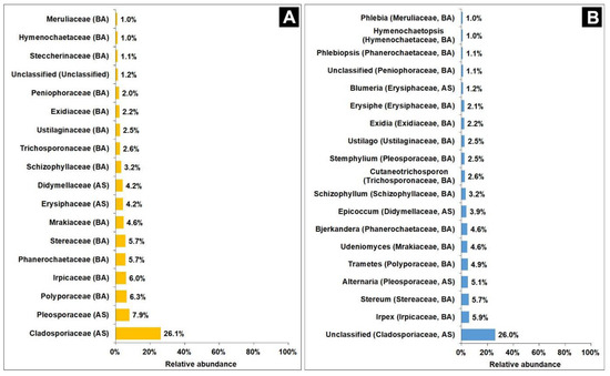 Among fungal communities, the phyla Ascomycota (48%) and Basidiomycota (49.8%) were predominant (Table 1). At the family level, a total of 65 fungal communities were detected; of these, 11 families were unclassified. Figure 11A shows 18 fungal families with a relative abundance of >1%. Cladosporiaceae belonging to the phylum Ascomycota was the predominant family, accounting for 26.1% of the fungal community. Pleosporaceae (Ascomycota) was the second-largest family (7.9%) in the fungal community, followed by Polyporaceae (6.3%), Irpicaceae (6.0%), Phanerochaetaceae (5.7%), and Stereaceae (5.7%) belonging to the phylum Basidiomycota, in the given order. Two families belonging to Ascomycota (Erysiphaceae and Didymellaceae) and one family belonging to Basidiomycota (Schizophyllaceae) accounted for >3% of the fungal community.