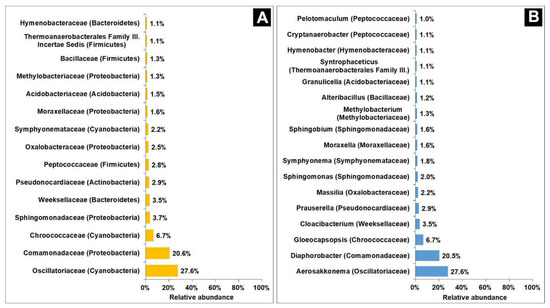 At the family level, a total of 109 bacterial communities were detected in waterlogged archaeological rosewood; of these, six families were unclassified. Fifteen families had a relative abundance of >1% (Figure 12A). Oscillatoriaceae (Cyanobacteria) and Comamonadaceae (Proteobacteria) were the predominant families, accounting for 27.6% and 20.6% of the bacterial community, respectively (Figure 12A). Next, the families Chroococcaceae (6.7%, Cyanobacteria), Sphingomonadaceae (3.7%, Proteobacteria), and Weeksellaceae (3.5%, Bacteroidetes) accounted for >3% of the bacterial community (Figure 12A).
