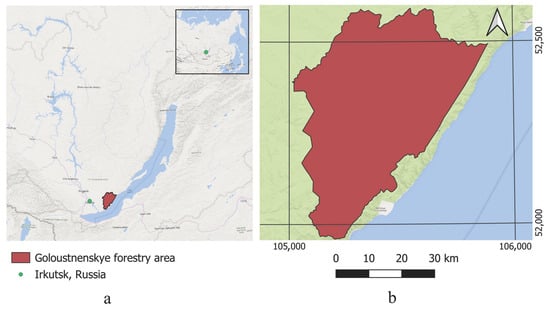 Study area: (a) location of the Goloustnenskye forestry area; (b) map of the Goloustnenskye forestry area.