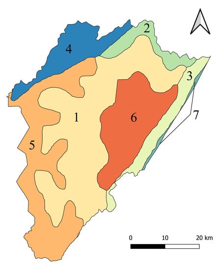 The soil parameters for polygons 2 and 5 (Figure 2) are the same, but they differ significantly in the amount of precipitation (384.49 and 421.79 mm) and elevation (870.11 and 848.83 m), so they cannot be combined. It was shown in [35] that the accuracy of the separation of ecoregions has a rather strong effect on the predictions of species distribution on the landscape scale. Figure 3 shows that the central polygons 1 and 6 noticeably differ with respect to the values of climatic parameters. Polygon 3 is close to polygons 2 and 5 in terms of soil characteristics but differs from them in all climatic parameters. As a result, it was decided to combine only polygons 3 and 7 for the convenience of calculations—polygon 7 has the smallest area, and the values of its climatic variables are close to the values of polygon 3. The resulting map of ecoregions contains six active polygons.