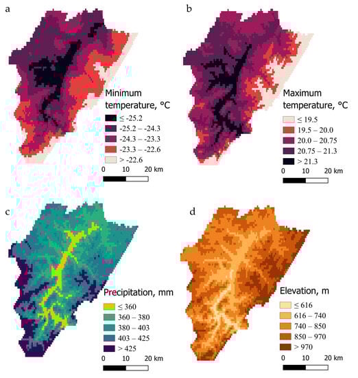 The climate data for the FLM typically include monthly averages of minimum and maximum air temperature and precipitation. Weather stations in the territory are not always present in sufficient numbers. For example, there is only one weather station in the NCEI (National Centers for Environmental Information (https://www.ncei.noaa.gov)) global database for our study area.