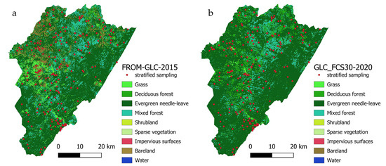 Land Cover classifications: (a) FROM-GLC-2015; (b) GLC_FCS30-2020 on the same set of classes.