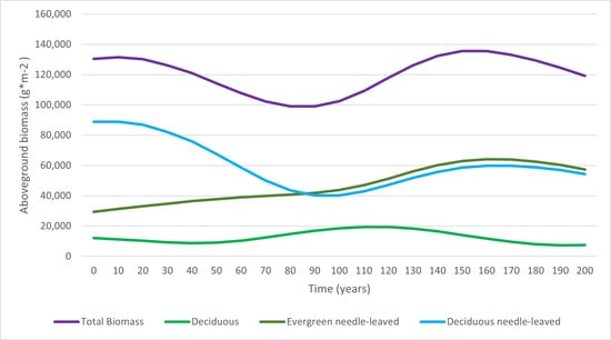 Biomass maps (Figure 7) show spatial dynamics. The image shows that at the beginning of the simulation, large amounts of biomass are concentrated in the northern and eastern parts of forestry. After 40 years, AGB is concentrated in the northwestern part; and after 80 years, it noticeably decreases. After 120 years, we see an increase in biomass in the southeastern part and after 160 years in the northwestern part; and after 200 years, a decrease in biomass is observed in the southeastern part. This spatial distribution of biomass over time is determined by the initial state of the study area (Figure 5)—there are more conifers in the southeastern part, which have a longer lifespan and higher biomass compared to the deciduous forest.