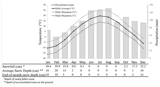 Daily maximum, average, and minimum temperature, precipitation, and average snowfall and depth by month of the year registered since 1981 to 2010 at the Bromptonville station (ID station: 7020860), in Québec, Canada. Data and calculated values were provided by Environment and Climate Change Canada (graph modified from Canadian Climate Normals []).