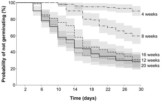 Kaplan–Meier estimates of survivor functions for Frangula alnus seeds submitted to different stratification periods (in weeks). The Y-axis reflects the cumulative probability, and the time in days is indicated along the X-axis. The curves represent the probability of not germinating initially and throughout the interval until the beginning of the next interval (grey areas indicate 95% confidence intervals).