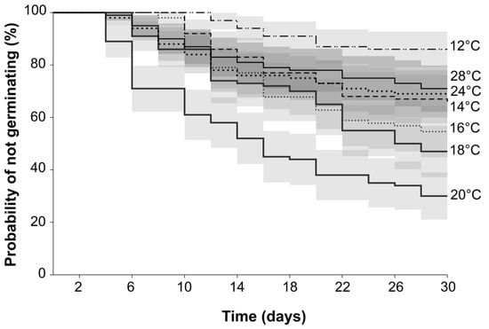 Stratification and temperature—Kaplan–Meier estimates of survivor functions were generated for each stratification period (4, 8, 12, 16, and 20 weeks) and for each temperature (12, 14, 16, 18, 20, 24, and 28 °C). Survival curves were built plotting the survival probability against time and then the median survival time was calculated. As seeds germinated independently of one another, the probability of germination was multiplied together using the Nelson–Aalen estimator to obtain the cumulative hazard function. Greenwood’s formula was used to calculate the linear pointwise confidence intervals for the Kaplan–Meier survival and cumulative hazard. Differences between treatments were assessed by comparing the survival curves, including the hazard rates (hazard ratio). Log-rank tests were performed to test the null hypothesis that the hazard rates of all treatments were equal. Most of these tests are performed by comparing the hazard rate against the expected hazard rate. The various hazard rates may be weighted equally through time or differently, with some tests applying heavier weight to early or later germination []. The hypothesis of hazard rate equality was rejected if this value was less than 0.05.